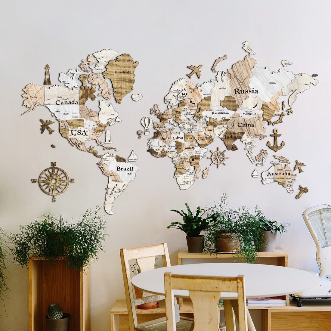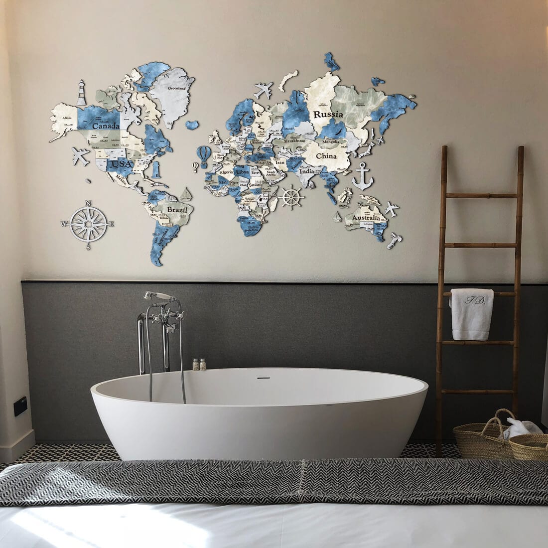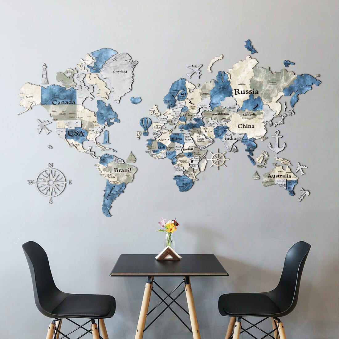 3D Colored Wooden World Map (Standart) - Diamond Blue