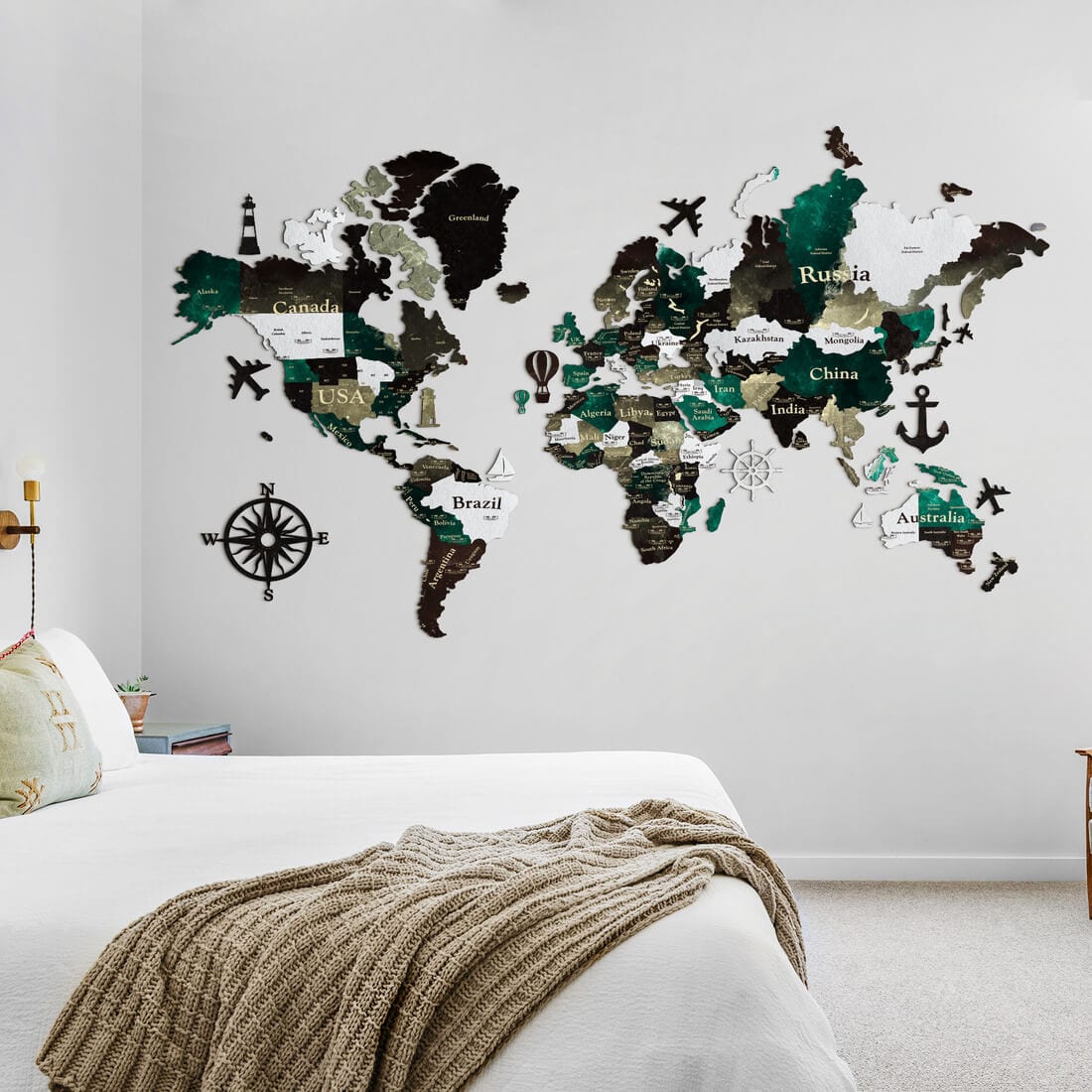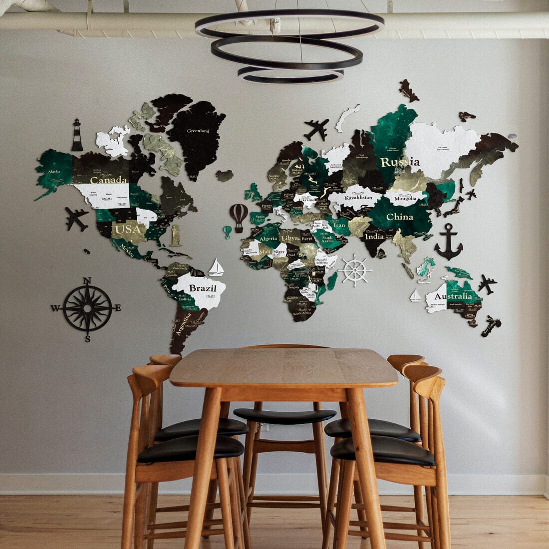 3D Colored Wooden World Map (Standart) - Emerald Green