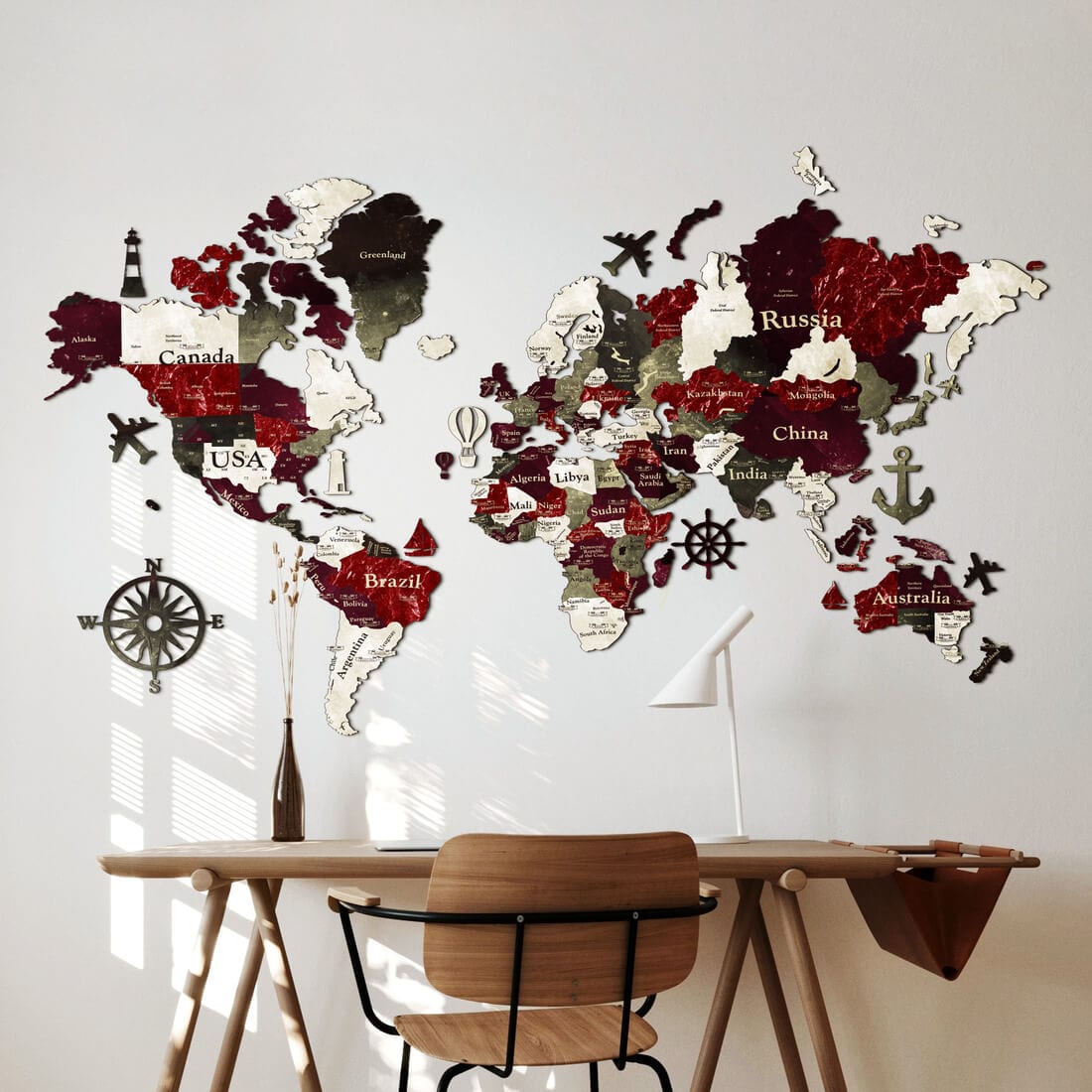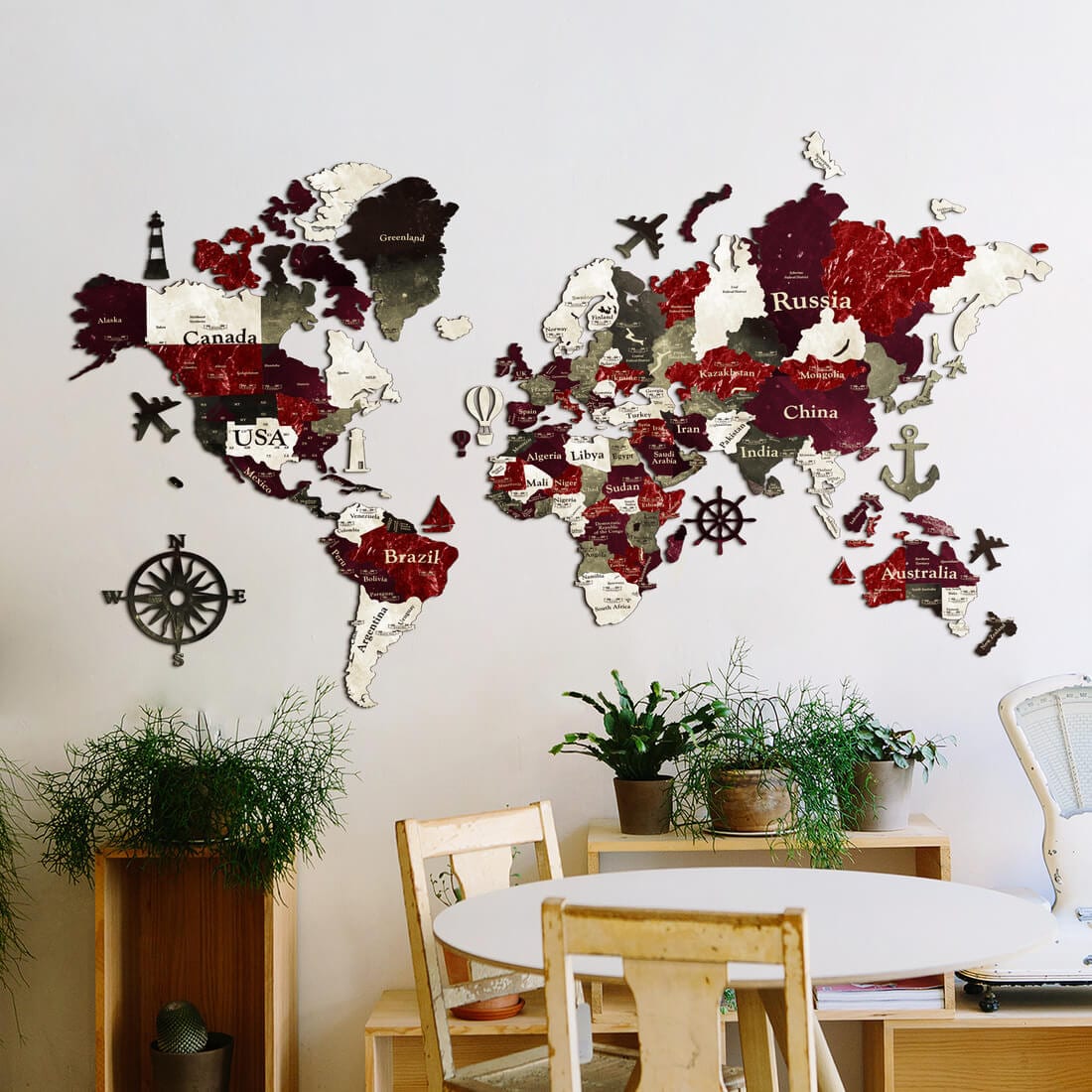 3D Colored Wooden World Map (Standart) - Ruby Red