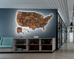 ● Wooden 3D LED Map of the USA with States Borders, Names, and Capitals