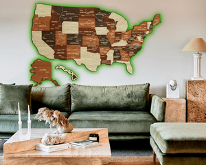 No doubt, the wooden map will become an eye-catching part of the interior at any place. Handcrafted birch plywood pieces, perfected with precise laser engravings, backlit with colored LED lights — this extraordinary LED USA Map will brighten up your home any time of the day and become the center of attention!