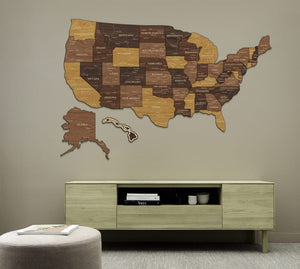 Wooden 3D Map of the USA with States Borders, Names, and Capitals