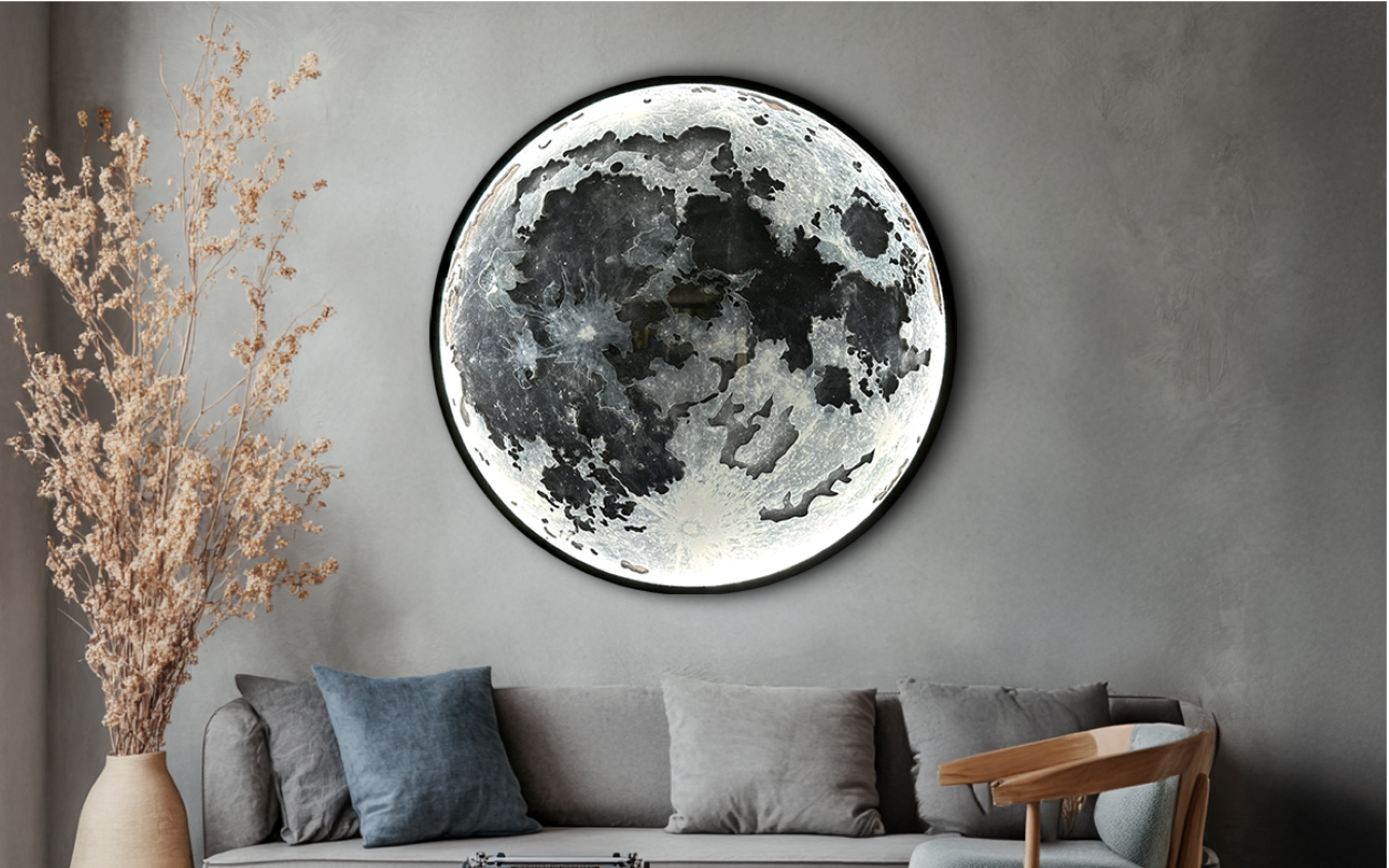 The wooden moon with soft, warm backlighting adds coziness to any interior.