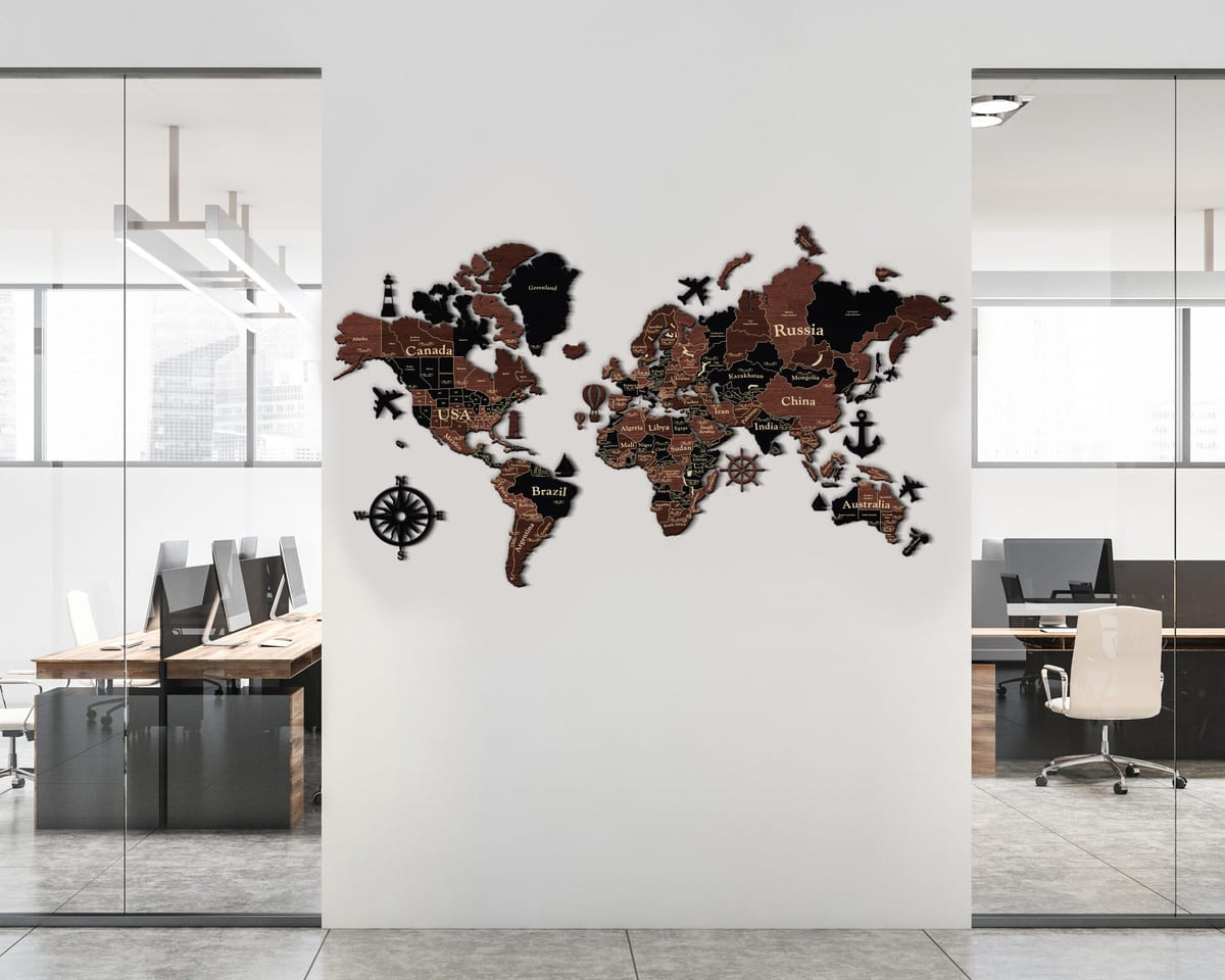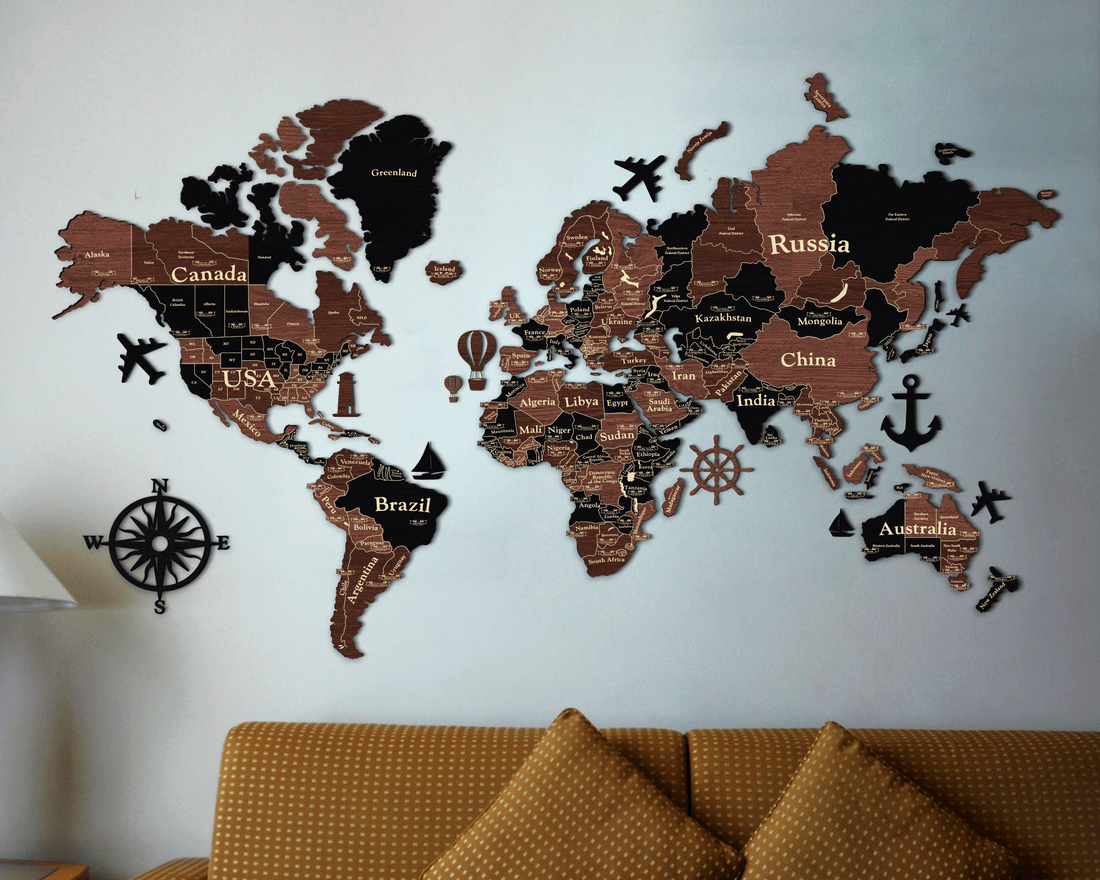 3D Wooden World Map (Standart) - Grey with Brown