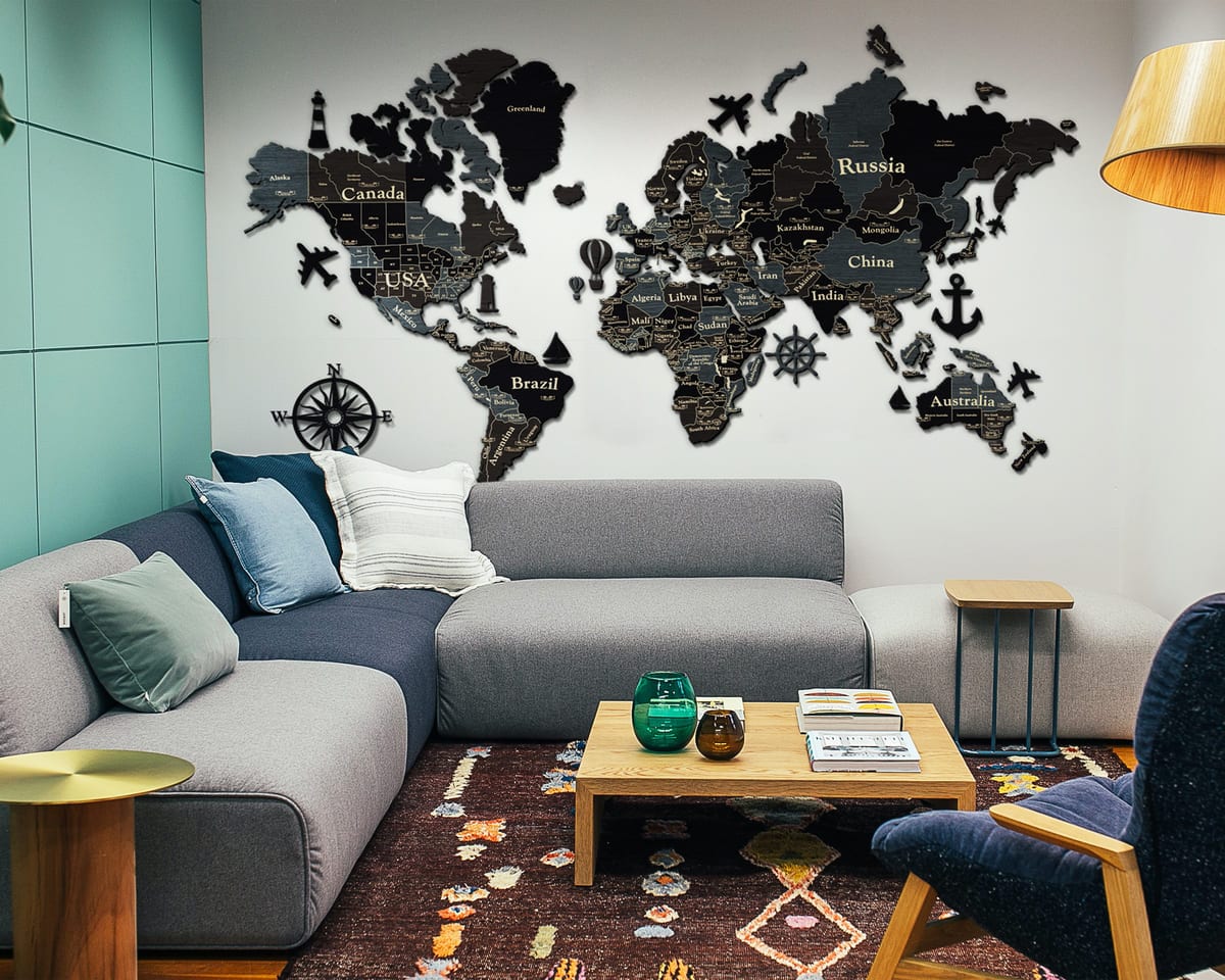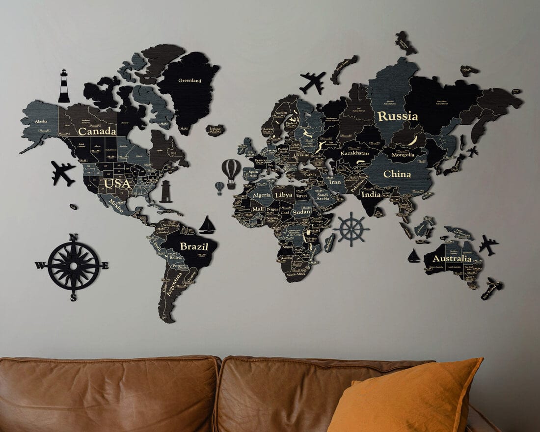 3D Wooden World Map (Standart) - Dark Grey