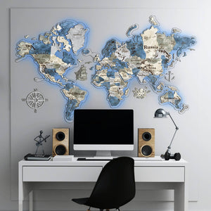 Our 3D world wall map is made from high-quality wood. It is detailed and precise. All the details engraved on the map are really impressive. Our wood world map is accompanied with free add-ons. They are 40 handmade wooden pins to mark the places you have been to or the ones you’re planning to visit, an anchor, an octopus, a compass rose, and a ship with sea-gulls. The latter ones are wooden decals you can easily attach to the wall as a part of the map or alone somewhere else. With and without add-ons, our map looks just awesome. Handcrafted birch plywood pieces, perfected with precise laser engravings, backlit with colored LED lights — this extraordinary LED World Map will brighten up your home any time of the day and become the center of attention! Explore the world from the comfort of your own home!