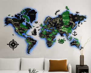 Our 3D world wall map is made from high-quality wood. It is detailed and precise. All the details engraved on the map are really impressive. Our wood world map is accompanied with free add-ons. They are 40 handmade wooden pins to mark the places you have been to or the ones you’re planning to visit, an anchor, an octopus, a compass rose, and a ship with sea-gulls. The latter ones are wooden decals you can easily attach to the wall as a part of the map or alone somewhere else. With and without add-ons, our map looks just awesome. Handcrafted birch plywood pieces, perfected with precise laser engravings, backlit with colored LED lights — this extraordinary LED World Map will brighten up your home any time of the day and become the center of attention! Explore the world from the comfort of your own home!