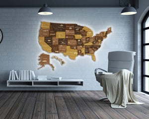 ● Wooden 3D LED Map of the USA with States Borders, Names, and Capitals
