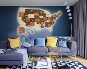 No doubt, the wooden map will become an eye-catching part of the interior at any place. Handcrafted birch plywood pieces, perfected with precise laser engravings, backlit with colored LED lights — this extraordinary LED USA Map will brighten up your home any time of the day and become the center of attention!