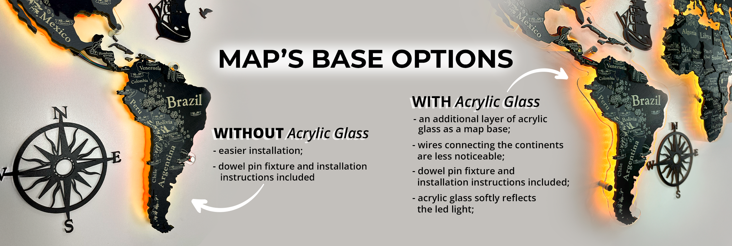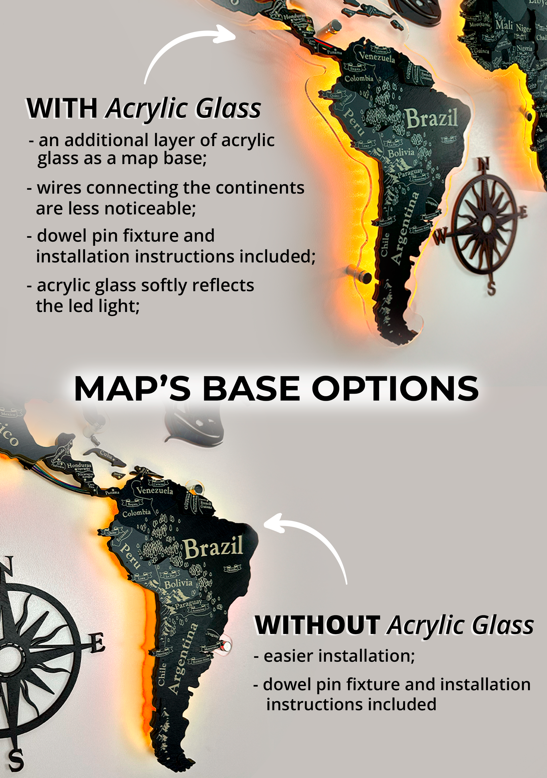 Our 3D world wall map is made from high-quality wood. It is detailed and precise. All the details engraved on the map are really impressive. Our wood world map is accompanied with free add-ons. They are 40 handmade wooden pins to mark the places you have been to or the ones you’re planning to visit, an anchor, an octopus, a compass rose, and a ship with sea-gulls. The latter ones are wooden decals you can easily attach to the wall as a part of the map or alone somewhere else. With and without add-ons, our map looks just awesome. Handcrafted birch plywood pieces, perfected with precise laser engravings, backlit with colored LED lights — this extraordinary LED World Map will brighten up your home any time of the day and become the center of attention! Explore the world from the comfort of your own home!