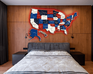 No doubt, the wooden map will become an eye-catching part of the interior at any place. Handcrafted birch plywood pieces, perfected with precise laser engravings, backlit with colored LED lights — this extraordinary LED USA Map will brighten up your home any time of the day and become the center of attention!